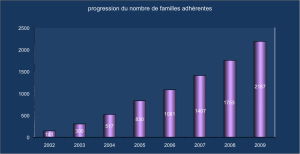 Depuis sa création en février 2002 l’association regroupe 2200 familles adhérentes. On peut constater une accélération de la progression des adhésions au cours de l’année 2009. Après avoir marque deux paliers à 400 puis 600 adhérents l’association a atteints 820 adhérents durant l’année 2009, nous pensons que le nombre d’adhérent devrait dépasser els 1000 durant l’année 2010.