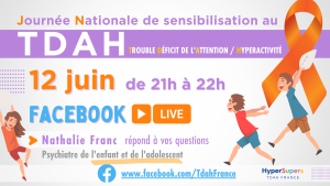 Depuis la page facebook de l’association https://www.facebook.com/TdahFrance pour une heure en Live de 21h à 22h le 12 juin, le Dr Nathalie Franc, psychiatre de l’enfant et de l’adolescent répondra à vos questions, cette séquence sera animée par Christine Gétin et les bénévoles de l’association.