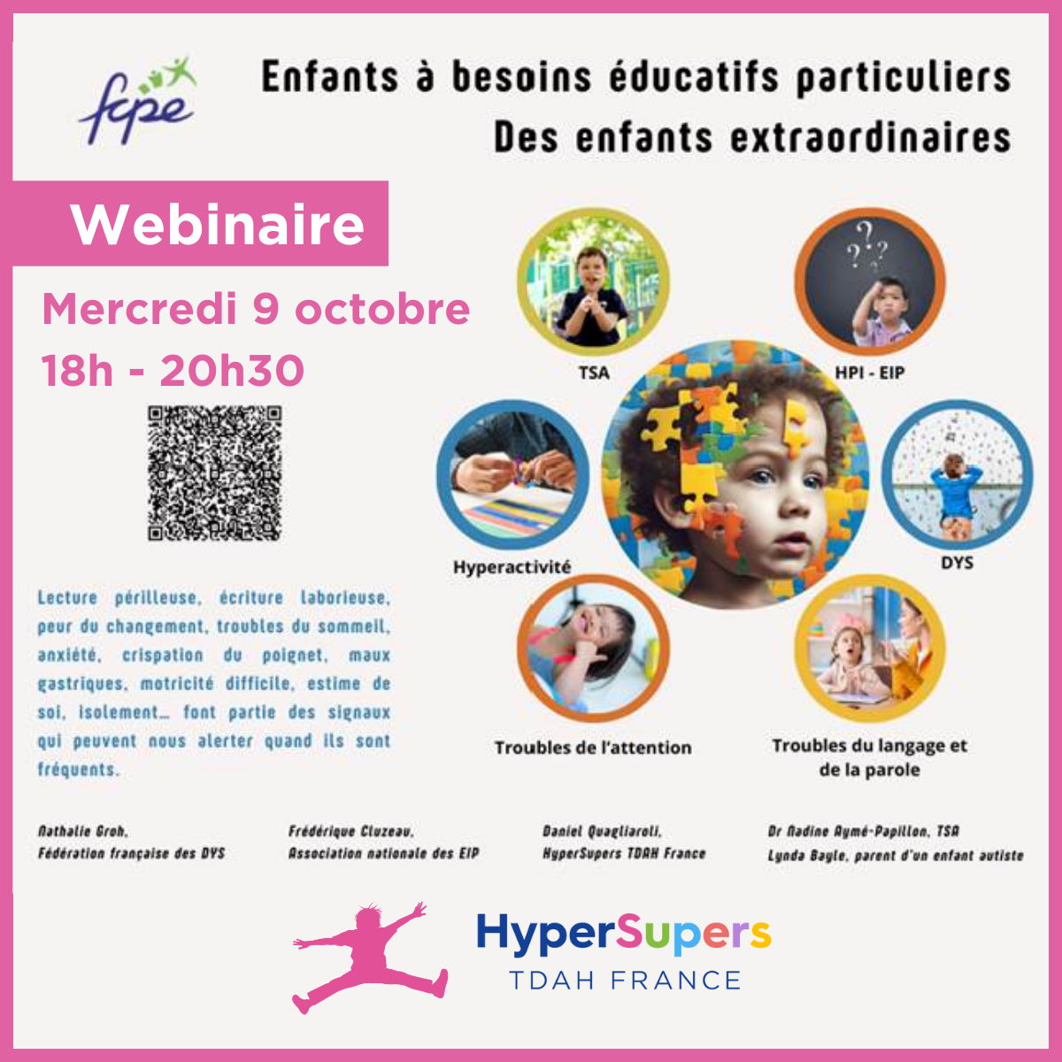 La FCPE - Fédération des Conseils de Parents d’Elèves des écoles publiques a le plaisir de vous inviter à un webinaire intitulé « Élèves à besoins éducatifs particuliers, des enfants extraordinaires » qui se tiendra le mercredi 9 octobre 2024 de 18h à 20h30.